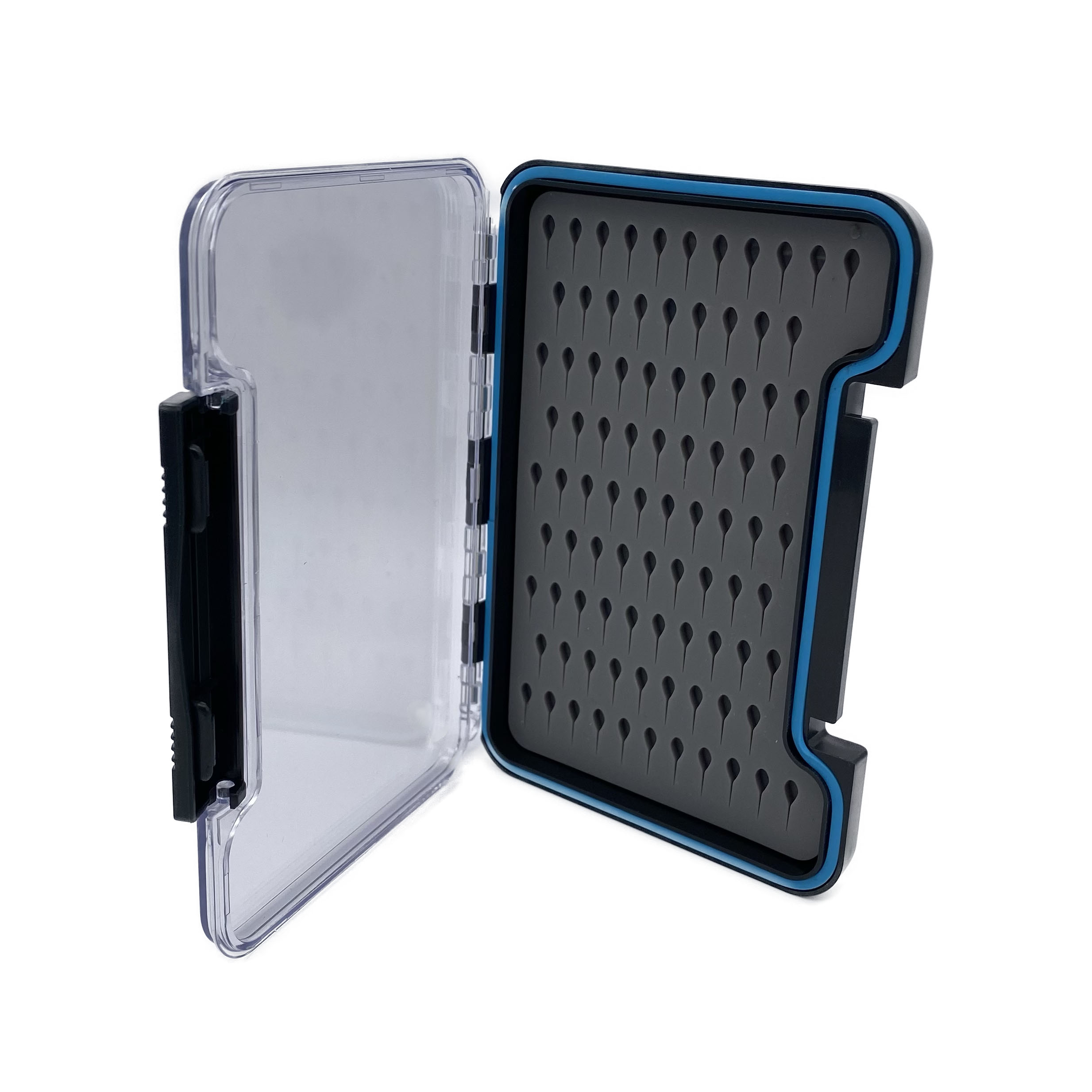 Boite étanche en ABS rigide extra fine disposant d'un fond silcone en découpe "goutte" pour un maintien optimal des mouches. Idéale pour le stockage des mouches à hackle ou pour les hameçons et billes