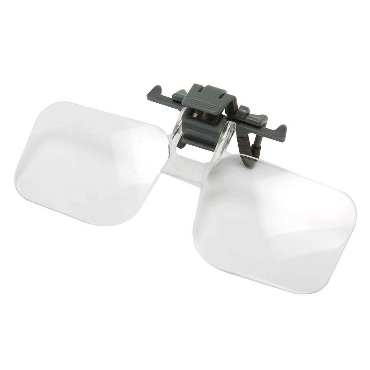 Loupe montée sur une armature relevable, qui se fixe sur tous les types de lunettes.