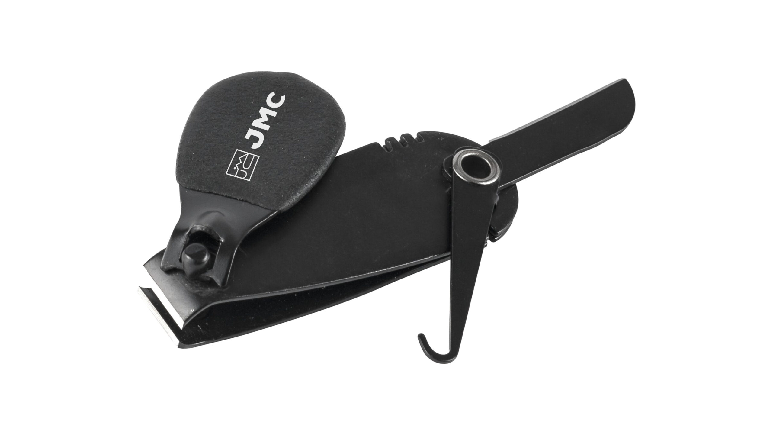Coupe-fil ergonomique de précision avec fonction crochet déboucheur d’œillet et lame. Finition noire anti-reflet.