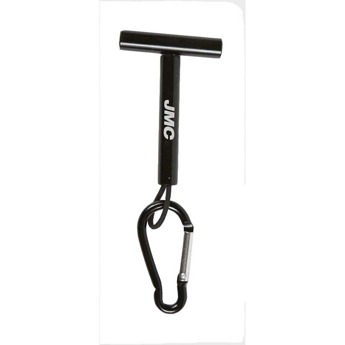 Accessoire permettant de stocker des bobines de fils de différents diamètres – muni d’un mousqueton pour se fixer rapidement au gilet ou chest-pack – réalisé en aluminium.