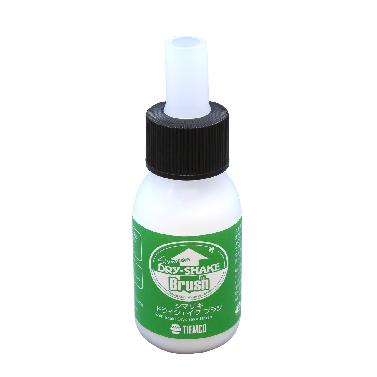 Flacon de Dry Shake blanc muni d'un pinceau pour une application précise de la poudre directement sur la mouche
