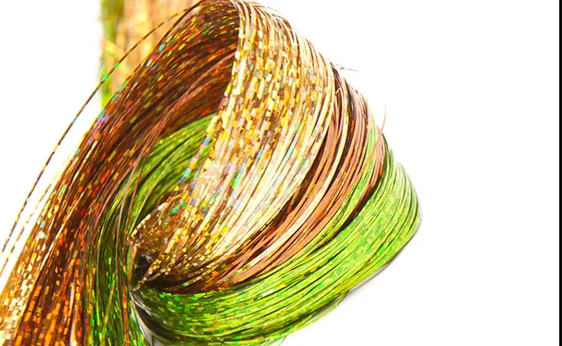 Crystalflash, Glossy Flash, Crimpy Flash, ou à des fibres naturelles telles que le marabout dans les queues de streamers.