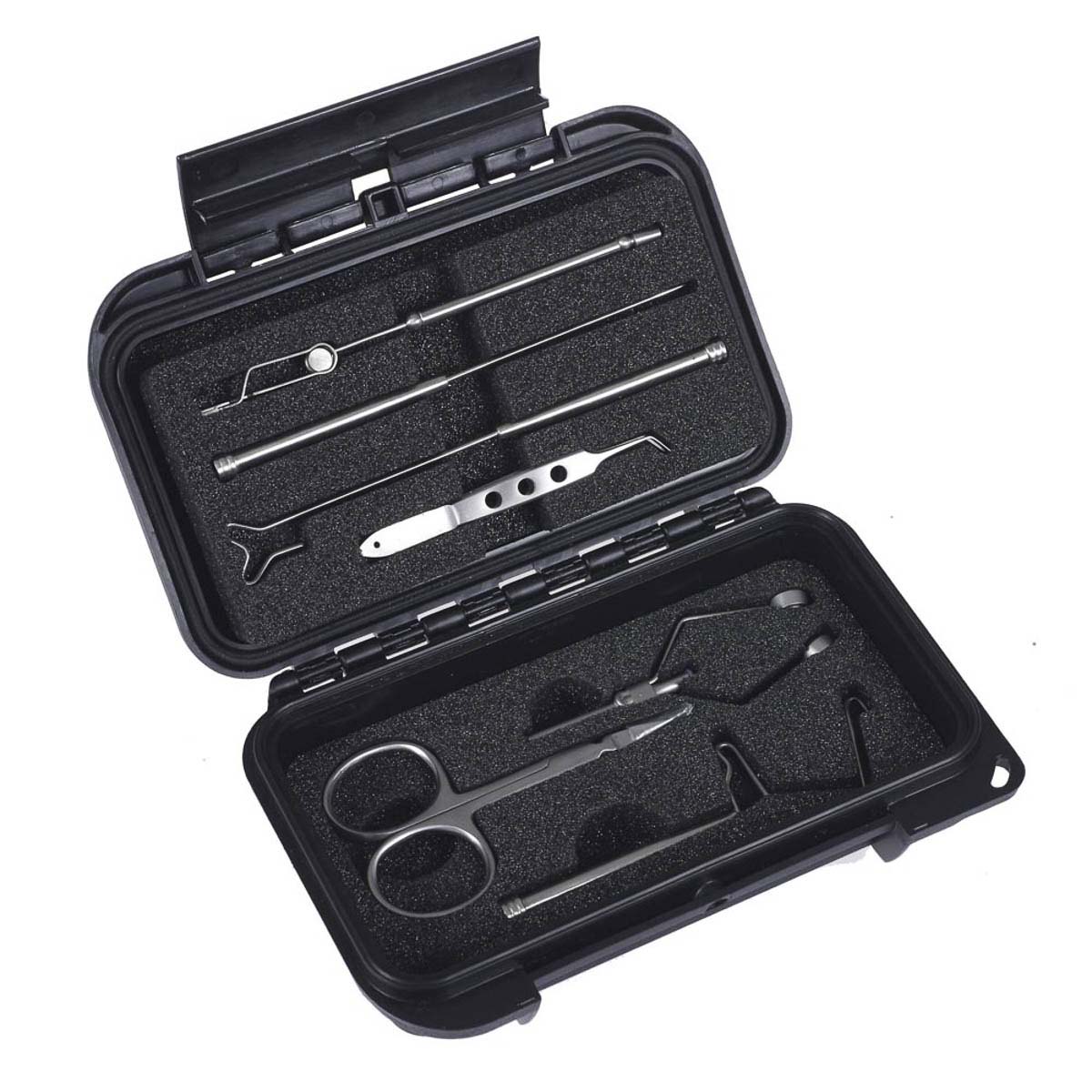 Assortiment d'outils Pro tyer présentés dans une boîte étanche.